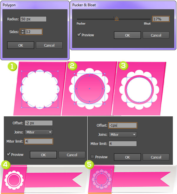 Внутри получившейся фигуры нарисуйте круг инструментом Ellipse/Эллипс (L). Укажите ему параллельный контур (Object > Path > Offset Path/Объект>Контур>Создать параллельный контур) с отступом в -2 px. Теперь укажите параллельный контур последнему образовавшемуся кругу с отступом в -1 px. Выделите первый нарисованный круг и многоугольник. Кликните по иконке Minus Front/Минус верхний в палитре Pathfinder/Обработка контура. Выделите следующие два круга и кликните по той же иконке в палитре Pathfinder/Обработка контура. Сгрупприуйте все элементы, составляющие получившейся цветочек и укажите ему белый цвет заливки. Также смените Blending Mode/Режим наложения на Soft Light/Мягкий свет. Инструментом Pen/Перо дорисуйте линии, ленточки и хвосты.