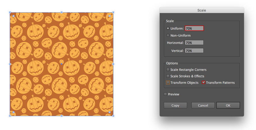 Выделите нашу тыкву и выберите в меню Object > Pattern > Make/Объект>Узор>Создать. В окне Pattern Options/Настройки узора укажите размер в 1200 x 1200 px. Вращайте и дублируйте тыкву, чтобы раскидать копии по всему узору, оставляя между ними достаточно пространства.