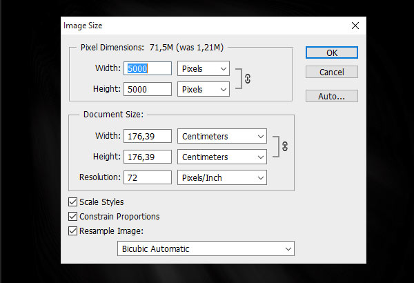 Создайте новый документ в Photoshop. Укажите Width/Ширину и Height/Высоту в 5000 рx и Resolution/Разрешение в 72. Нажмите OK.
