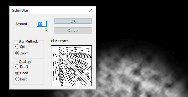 В меню выберите Filter > Blur > Radial Blur/Фильтр>Размытие>Радиальное размытие и настройте параметры как показано ниже. Также переместите центр размытия в верхнюю центральную область.