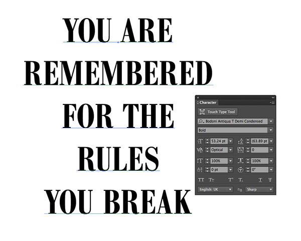 Вообще-то подобное искажение текста обычно нежелательно, являясь своеобразной дизайнерской бестактностью, но в нашем случае работа будет практически рукописной, поэтому мы можем себе это позволить. Масштабируйте текст по вертикали, чтобы ужать его немного.