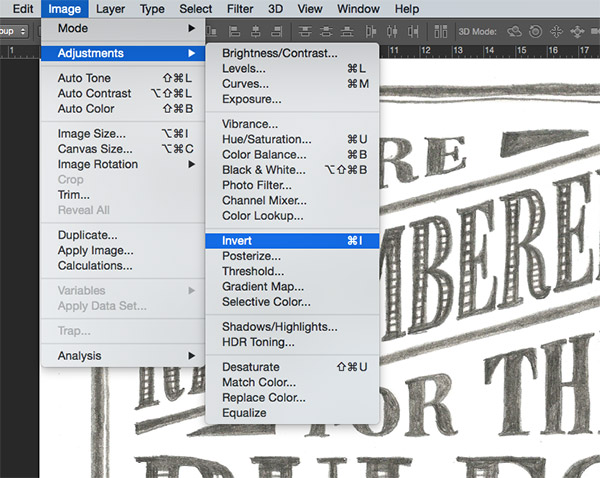 Откройте отсканированную работу в Adobe Photoshop и в меню выберите Image > Adjustments > Invert/Изображение>Коррекция >Инвертировать. После этого выберите в меню Image > Adjustments > Desaturate/Изображение>Коррекция>Обесцветить, чтобы убрать цветность из работы.