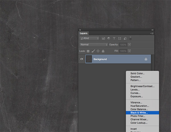 Скачайте текстуру школьной доски, затем при помощи этих советов по коррекции текстур выровняйте тона. Примените корректирующий слой Black and White/Черный и Белый, чтобы убрать цветность из текстуры.