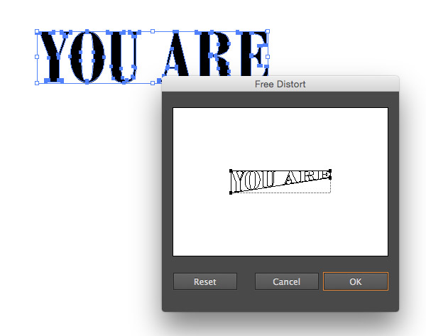 Выделите первую группу слов и в меню выберите Effect > Distort & Transform > Free Distort/Эффект>Исказить и трансформировать>Произвольное искажение. Поднимите нижнюю правую точку выше, чтобы исказить группу текста.