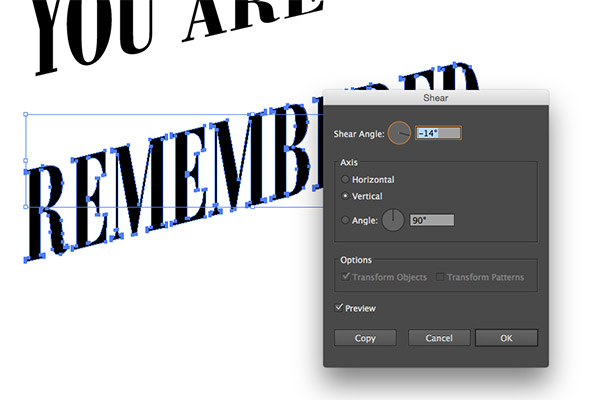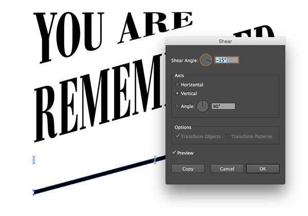 Возьмемся за следующую группу из нашего текста. Выделите ее и в меню выберите Object > Transform > Shear/Объект>Трансформировать>Наклон. Укажите угол, совпадающий с углом скоса предыдущей группы.