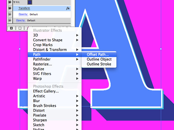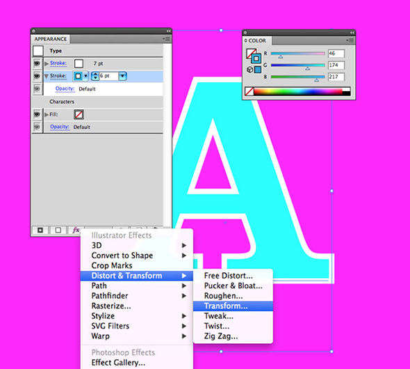 Создайте еще одну дополнительную обводку уже белого цвета и толщиной в 7pt. Она накроет обводку темно-бирюзового цвета. Выделите белую обводку в палитре Appearance/Оформление, кликните по иконке Effects/Эффекты и выберите Transform/Трансформировать.