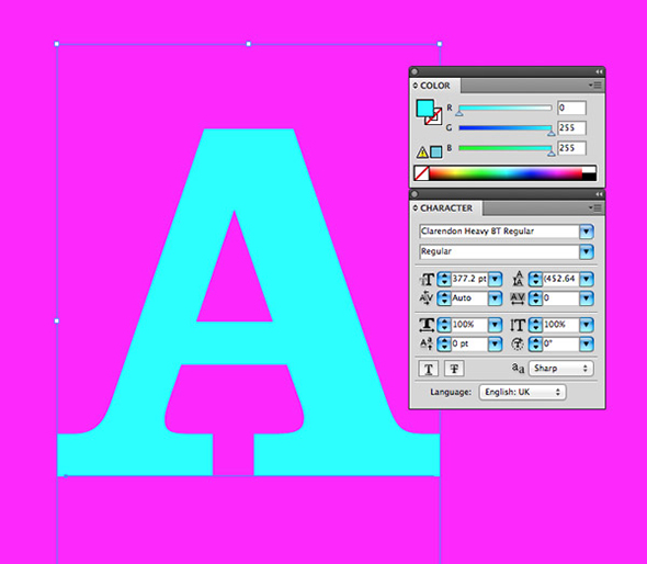 Нарисуйте прямоугольник по размеру холста и залейте его цветом маджента. Инструментом Type/Текст создайте букву в рабочей области. Используйте любой шрифт. В примере - Clarendon Heavy.