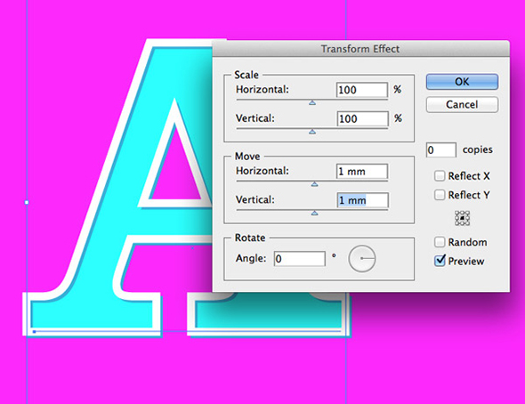 Выберите Distort & Transform > Transform/Искажение и трансформирование> Трансформировать, кликнув по иконке Effects/Эффекты и настройте параметры как показано выше.
