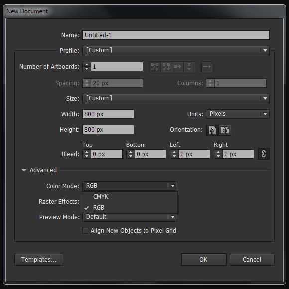 Откройте Adobe Illustrator и создайте новый документ (Cmd/Ctrl + N). Ваша монтажная область (artboard) может быть любого размера. Также в зависимости от ваших целей, вы можете выбрать и RGB и CMYK в качестве цветовой модели.