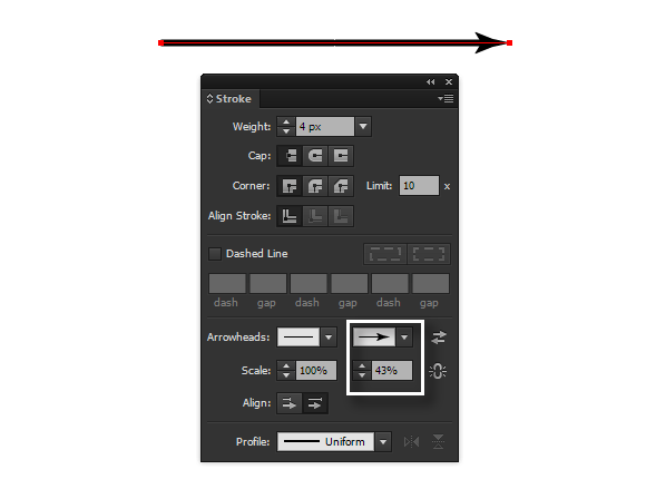 Там же, в палитре Stroke/Обводка, выберите choose the Arrowhead/Стрелку-указатель и снизьте значение до 43%.