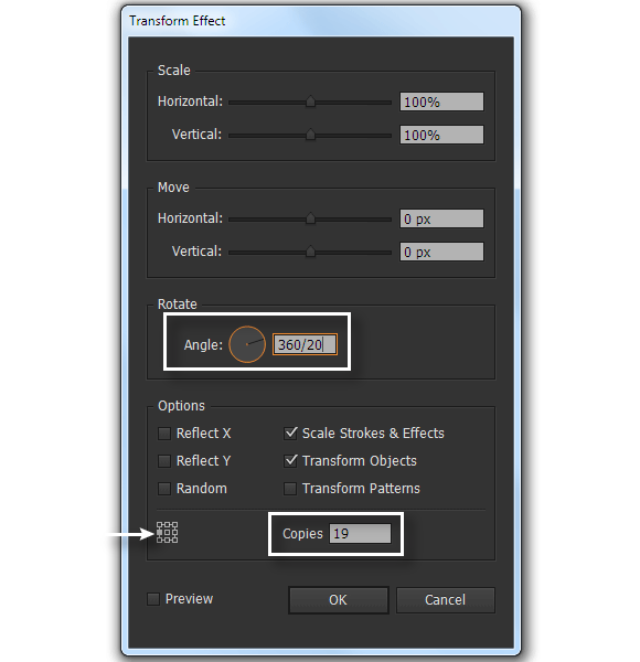 Сгруппируйте получившийся контур (Cmd/Ctrl + G). Выделите группу и в меню выберите Effect > Distort & Transform > Transform/Эффект>Трансформация и искажение>Трансформировать. Настройте параметры трансформации как показано ниже.