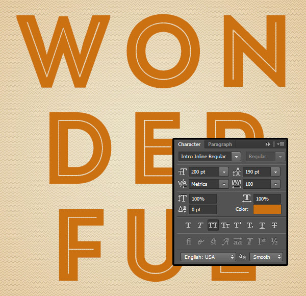 Введите ваш текст, используя шрифт Intro Inline Regular размером в Size 200 pt и любого цвета, так как мы все равно позже применим к нему стиль слоя Color Overlay/Перекрытие цвета.