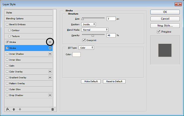 Кликните на иконку + для стиля Stroke/Обводка, вы заметите что появится еще одна вкладка Stroke/Обводка под оригинальной вкладкой. К ней применены те же параметры, что и к оригинальному стилю.