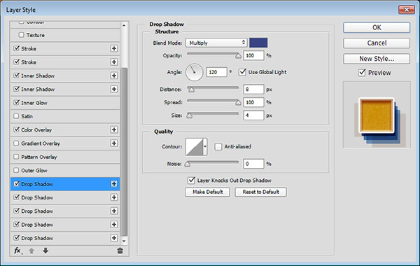 Добавьте еще одну вкладку со стилем слоя Drop Shadow/Тень, но уже с другими параметрами: