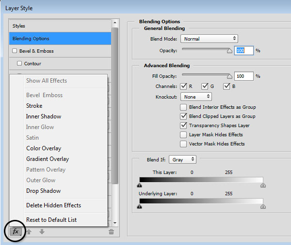 Опция Delete Hidden Effects/Удалить скрытые эффекты позволит избавиться от всех неиспользуемых или неактивных стилей и дополнительных вкладок. Вы можете в любой момент кликнуть по названию стиля в меню fx, чтобы показать его или добавить обратно в список.
