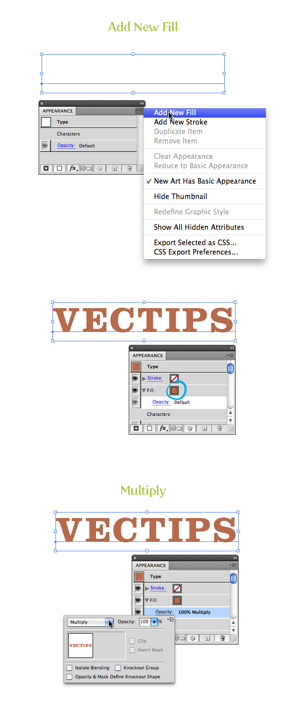 Не снимая выделения с текста укажите ему New Fill/Новую заливку в палитре Appearance/Оформление. Укажите новой заливке рыжеватый оранжевый цвет. В палитре Appearance/Оформление нажмите на стрелку выпадающего меню, чтобы видеть все атрибуты. Кликните по параметру Opacity/Непрозрачность и смените Blending Mode/Режим наложения на Multiply/Умножение.
