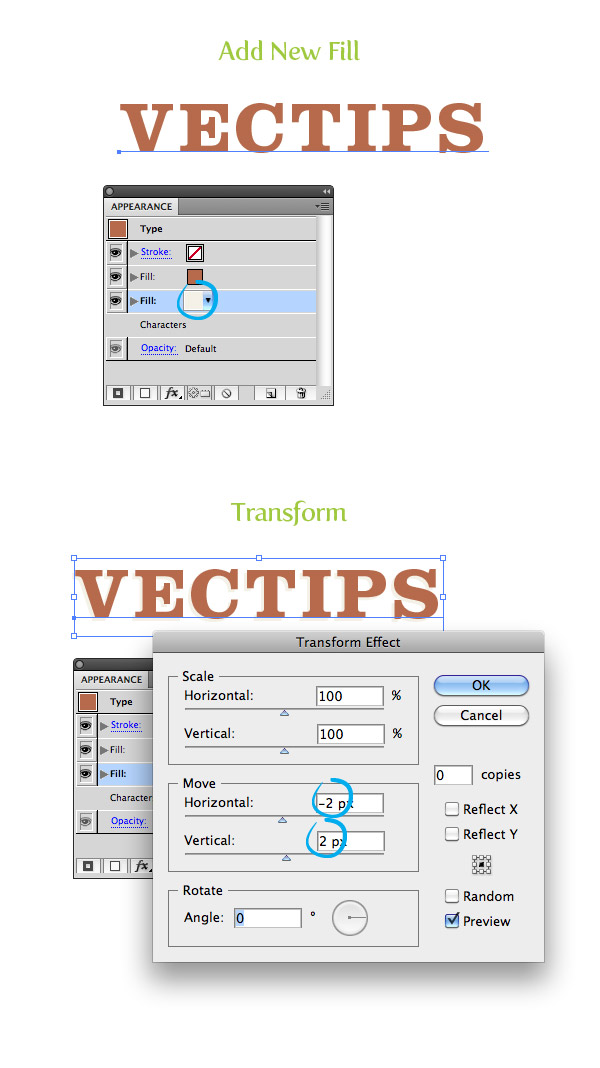 Создайте еще одну заливку в палитре Appearance/Оформление. Выделите нижнюю заливку и залейте ее светло-желтым цветом. Не снимая выделения с этой заливки, выберите в меню Effect > Distort & Transform > Transform/Эффект>Исказить и трансформировать>Трансформировать. В появившемся окне укажите Horizontal Move/Горизонтальное перемещение в -2 px и Vertical Move/Вертикальное перемещение в 2 px.