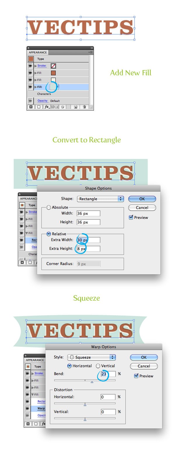 Создайте еще одну заливку под всеми предыдущими. Выделите ее и укажите ей светлый бирюзовый цвет. Не снимая выделения, выберите в меню Effects > Convert to Shape > Rectangle/Эффекты>Конвертировать в фигуру>Прямоугольник. В появившемся окне выберите вариант Relative/Относительный и укажите параметры как показано на второй картинке ниже.