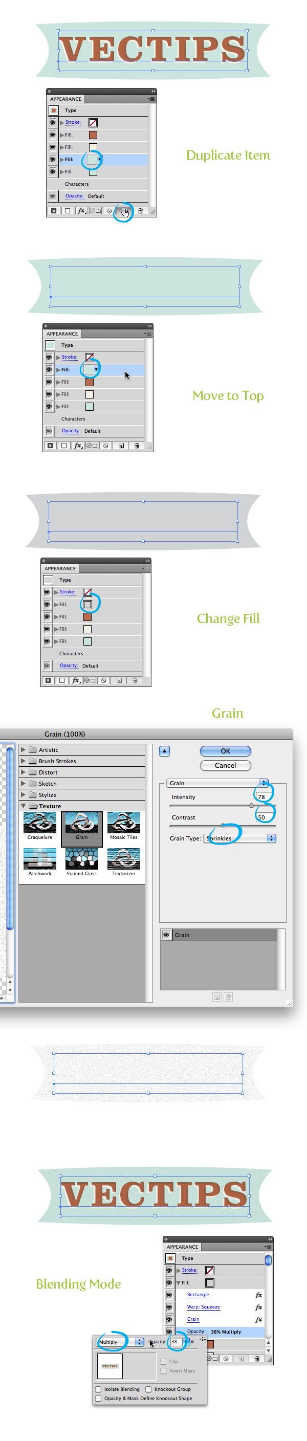 Не снимая выделения с бирюзового объекта, нажмите кнопку Duplicate Selected Item/Дублировать выделенный объект в нижней части палитры Appearance/Оформление. В той же палитре перетащите один из бирюзовых объектов поверх рыжевато-оранжевой заливки. Смените цвет верхней заливки на светло-серый. Не снимая выделения с объекта, в меню выберите Effects > Texture > Grain/Эффект>Текстура>Зерно. Настройте параметры эффекта как показано на четвертой картинке ниже, затем смените Blending Mode/Режим наложения объекта на Multiply/Умножение и снизьте Opacity/Непрозрачность до 38.