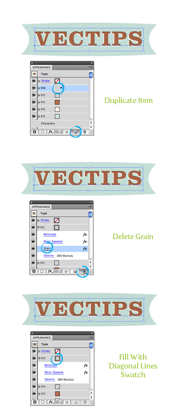 Дублируйте зернистый объект, выберите верхнюю копию и откройте атрибуты в палитре Appearance/Оформление. Выделите атрибут Grain/Зерно и нажмите на иконку мусорной корзины, чтобы удалить его. Залейте объект заливкой Diagonal Line/Диагональная линия. Вы можете найти ее, нажав нижнюю левую иконку Swatch Libraries/Библиотеки образцов в палитре Swatches/Образцы, затем выбрав Patterns > Basic Graphics > Basic Graphics_Textures/Узоры>Базовая графика>Базовая графика_текстуры.