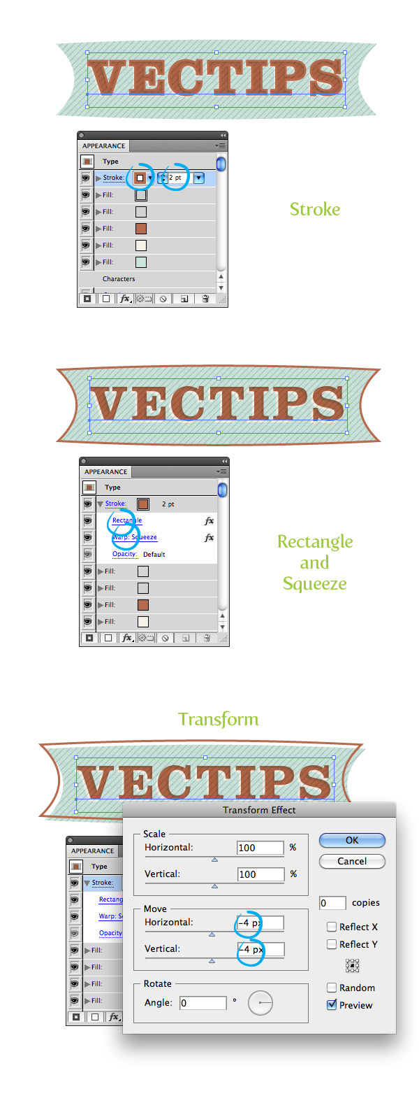Выделите объект с пустой обводкой в палитре Appearance/Оформление (перетащите поверх остальных объектов, если он не на самом верху). Укажите обводке рыжеватый цвет как у текста и толщину в 2 pt. Укажите обводке те же параметры rectangle/прямоугольник и squeeze/сжатие, что и у предыдущего объекта и смените Blending Mode/Режим наложения на Multiply/Умножение. Не снимая выделения с этого объекта, выберите в меню Effect > Distort & Transform > Transform/Эффект>Исказить и трансформировать>Трансформировать и в появившемся окне укажите Horizontal Move/Горизонтальное перемещение в -4 px и Vertical Move/Вертикальное перемещение в -4 px.