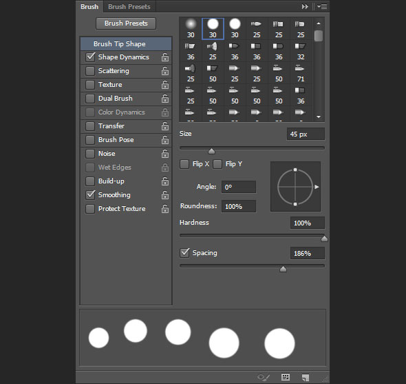 Выберите инструмент Eraser Tool/Ластик и откройте палитру Brush/Кисти (Window -> Brush/Окно>Кисти). В настройках Brush Tip Shape/Форма отпечатка кисти выберите круглую четкую кисть. Укажите ей Size/Размер примерно в 45px, и Spacing/Интервалы в 186%.