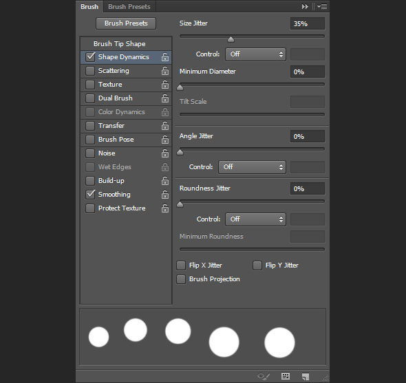 Также в закладке Shape Dynamics/Динамика формы укажите Size Jitter/Колебание размера в 35%.