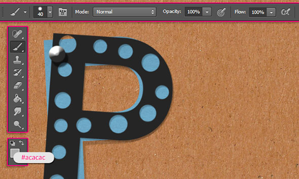 Возьмите инструмент Brush Tool/Кисть, выберите четкую круглую кисть размера примерно 40px (размер варьируется в зависимости от того, насколько большими вы хотите видеть заклепки). Укажите первый цвет #acacac. Просто кликайте по местам, где хотите поставить заклепку.