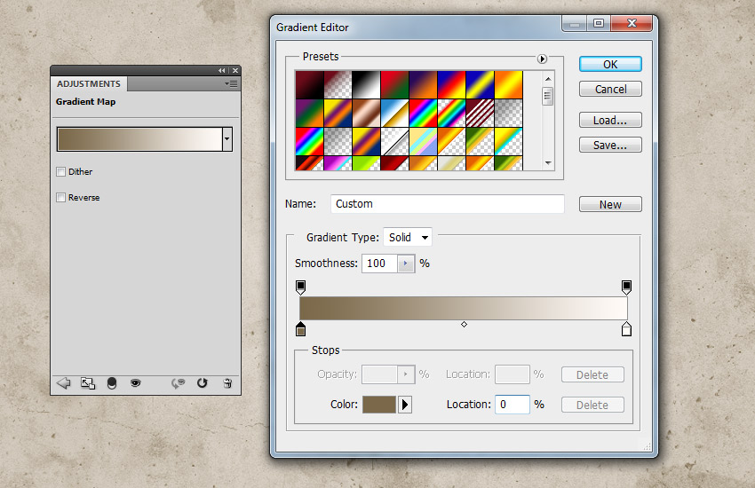В меню выберите Layer > New Adjustment Layer/Слой>Новый корректирующий слой и выберите Gradient Map/Карта градиента. Используйте цвета #7a6849 и #fffbf7.