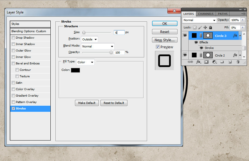 Укажите Fill/Заливку для слоя Circle 1 в 0%, и укажите ему стиль слоя Stroke/Обводка в 6 px, цвета #000000.