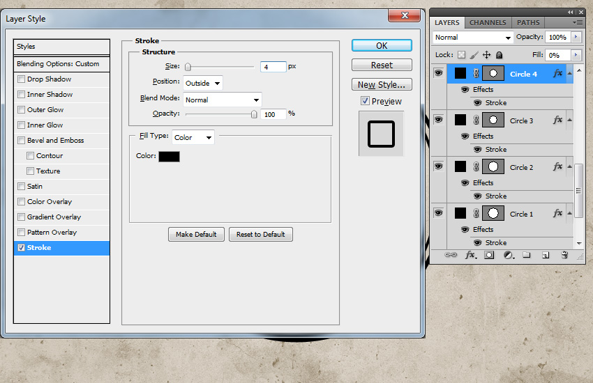 Укажите Fill/Заливку для слоя Circle 4 в 0% и Stroke/Обводку в 4px, цвета #000000.