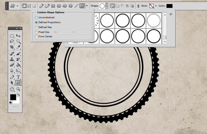 Выберите в качестве первого цвета #000000. Возьмите инструмент Custom Shape/Заказная фигура и включите опцию Defined Proportions. В этом уроке использована фигура no.17, но вы можете выбрать любую другую.
