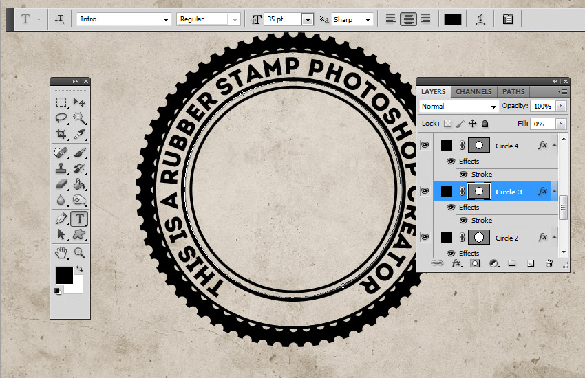 Кликните по иконке Vector Mask/Векторной маски слоя Circle 3. Возьмите инструмент Type/Текст и поместите его прямо на контур круга. Курсор изменит форму. Кликните по по кругу.