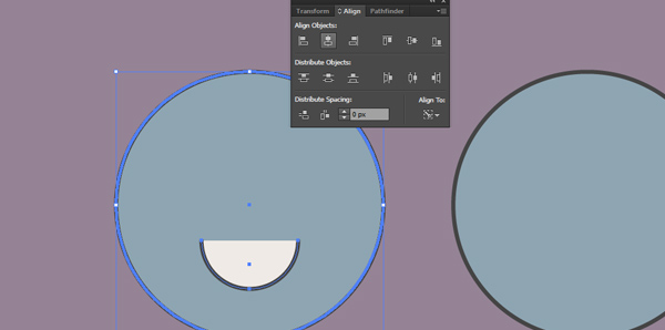 Поместите только что созданный вами круг внутрь первого круга побольше. Инструментом Direct Selection/Прямое выделение (A) выделите верхнюю точку меньшего круга и нажмите Backspace, чтобы удалить ее. Выделите большой круг и маленький полукруг, и в палитре Align/Выравнивание кликните по иконке Horizontal Align Center/Выравнивать центр по горизонтали.