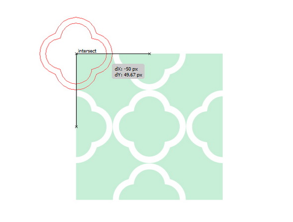 Удерживая кнопку Alt передвигаем фигуру из центра квадрата наверх, как показано на рисунке внизу. Alt нужно удерживать, чтобы сделать копию, а направляющие помогут вам совместить центр новой фигуры с верхней стороной мятного квадрата.