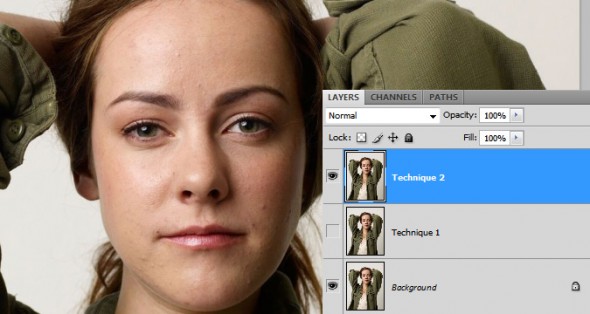 Откройте наш файл с изображение и продублируйте слой с ретушированной кожей (техника №1).