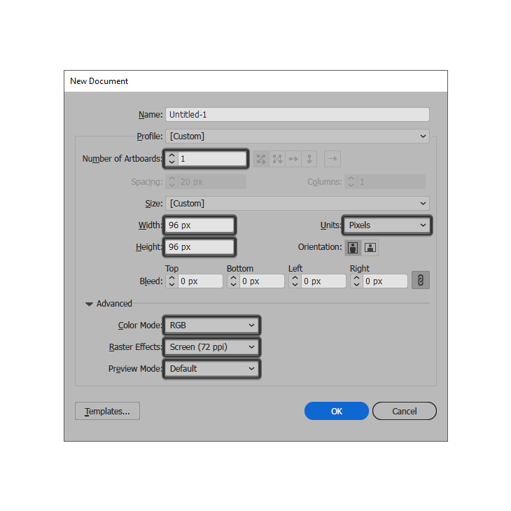 Для начала создайте новый документ, выбрав в меню File > New/Файл>Создать (или нажмите Control-N). Укажите документу следующие параметры: