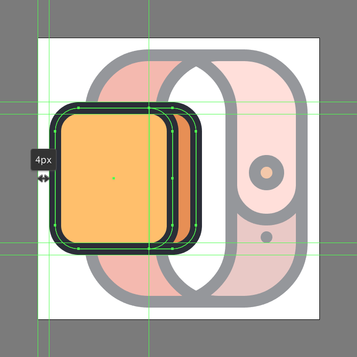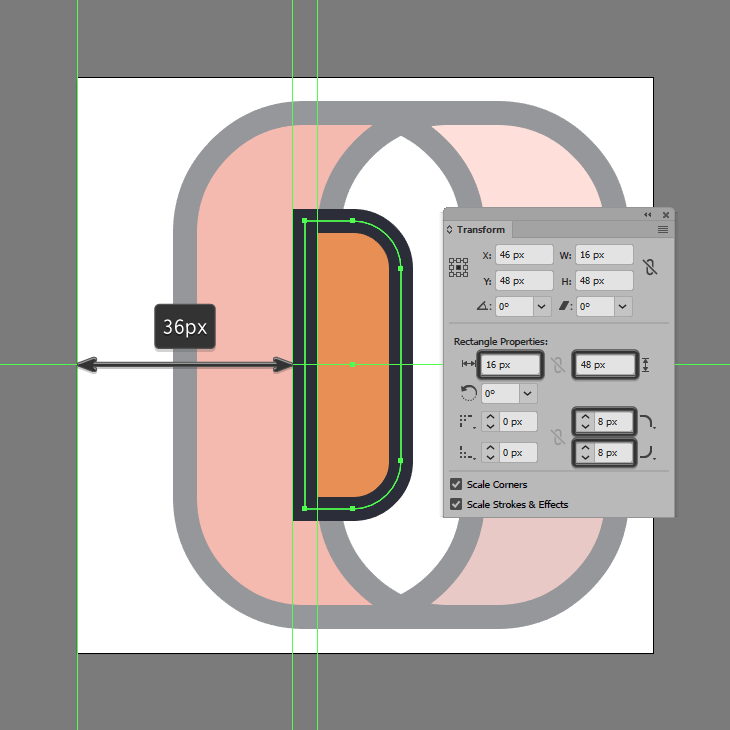 Начнем работу над самими часами. Нарисуйте прямоугольник размером 16 x 48 px (#E89054), скруглите его правые углы на 8 px в палитре Transform/Трансформация в разделе Rectangle Properties/Свойства прямоугольника. Укажите фигуре такую же обводку как у остальных объектов. Поместите фигуру как показано ниже.