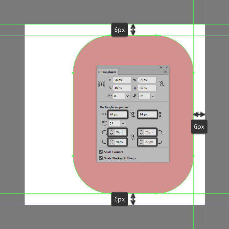 Начнем с создания ремешка. Нарисуйте прямоугольник со скругленными углами (rounded rectangle) размером 64 x 84 px и радиусом скругления углов (Corner Radius) в 20 px. Укажите прямоугольнику цвет #D3928D и поместите его на холсте как показано ниже.