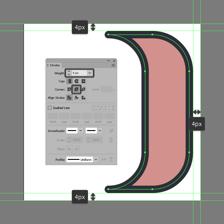 Выделите две нижние точки инструментом Direct Selection/Прямое выделение (A) и скруглите их на 12 px при помощи функции Live Corners/Живые углы. Укажите фигуре обводку толщиной в 4 px и цвета #262A35.