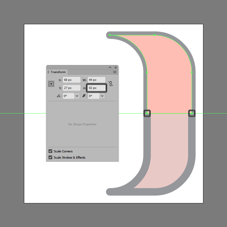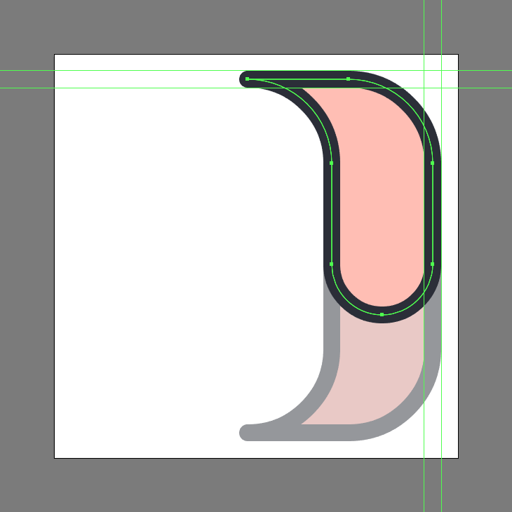 Дублируйте нашу фигуру (Control-C > Control-F), укажите копии цвет заливки #FFBFB6, инструментом Delete Anchor Point/Удалить опорную точку удалите все точки нижние точки так, чтобы осталось только часть, показанная ниже.