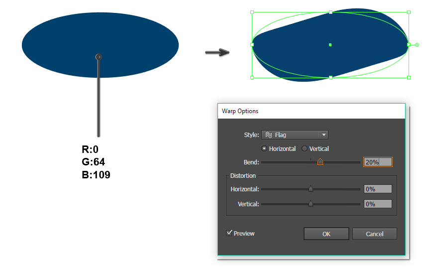 Инструментом Ellipse/Эллипс (L) нарисуйте овал. Укажите ему отсутствие обводки и заливку темно-синего цвета. Выделите овал и в меню выберите Effect > Warp > Flag/Эффект>Деформация>Флаг. Укажите параметры как показано ниже и посмотрите что получается.