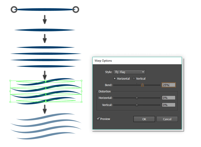 Выделите начальный элемент вязи и в меню выберите Effect > Distort & Transform > Transform/Эффект>Искажение и трансформация>Искажение. Также настройте опции, но на этот раз работайте с параметром Move Horizontal/Переместить горизонтально.