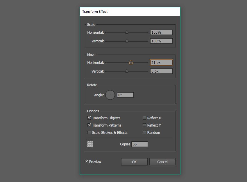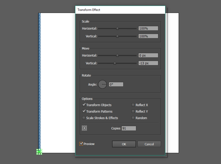 Выделите нашу группу, и в меню выберите Effect > Distort & Transform > Transform/Эффект>Искажение и трансформация>Искажение. Укажите параметры как показано ниже. Однако если вы выбрали другой размер базового элемента, вам нужно будет подобрать другие параметры. В опции Move Vertical/Переместить вертикально двигайте бегунок влево, и в режиме просмотра найдите нужную позицию. Также укажите количество копий, которое позволит заполнить весь столбец документа.