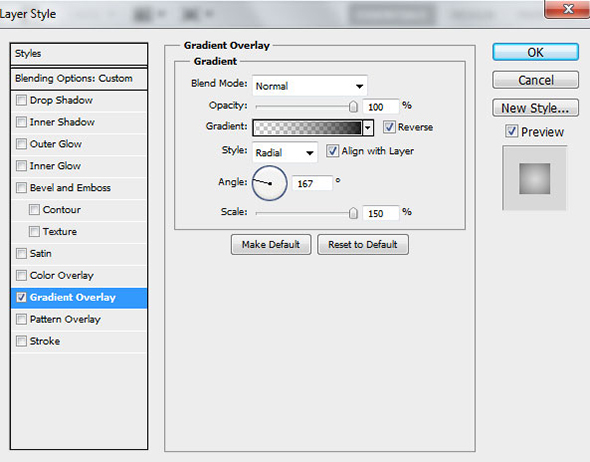 Примените к слою с эллипсом стиль слоя Gradient Overlay/Перекрытие градиента.