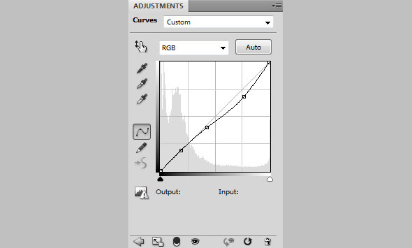 В палитре Layers/Слои кликните по иконке Create new fill or adjustment layer/Создайте новый корректирующий слой или слой-заливку и выберите вариант Curves/Кривые. Настройте кривые как показано ниже.