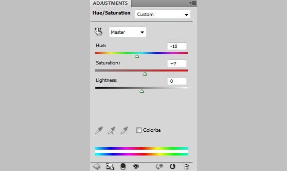 Вновь создайте новый корректирующий слой или слой-заливку, на этот раз выберите Hue/Saturation / Оттенок/Насыщенность. Настройте коррекцию как показано ниже.