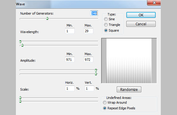 Теперь нам нужно растрировать получившийся слой. Для этого создайте новый пустой слой под этим и нажмите CTRL+E чтобы объединить слои. Примените к получившемуся слою Filter > Distort > Wave/Фильтр>Деформация>Волна.