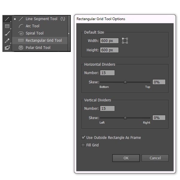 Для начала нам понадобится сетка. Мы используем инструмент Rectangle Grid/Прямоугольная сетка. Кликните один раз левой кнопкой мыши в документа. Введите параметры как показано ниже и нажмите OK.