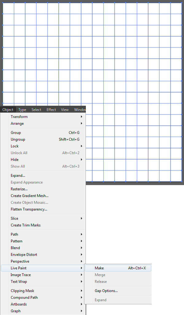 После того как вы создадите сетку, выровняйте в рабочей области и выберите в меню Object > Live Paint > Make/Объект>Быстрая заливка>Создать.